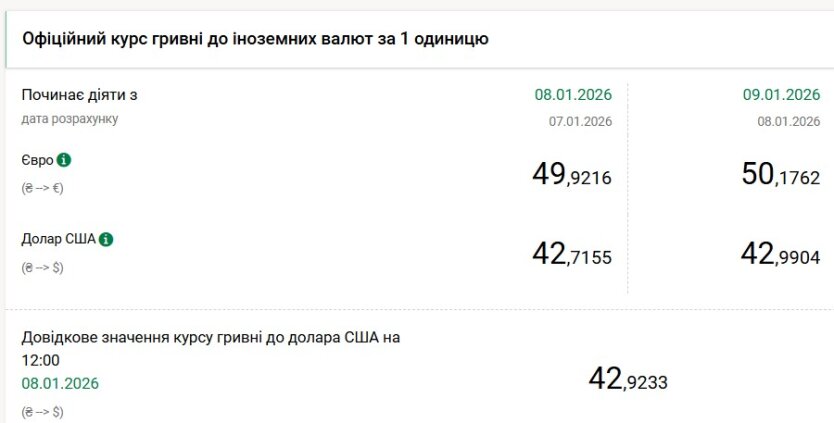 Национальный банк Украины обновил исторические рекорды официальных курсов валют на 9 января. Стоимость доллара вплотную приблизилась к отметке 43 гривны, а евро уверенно закрепился выше 50 гривен.