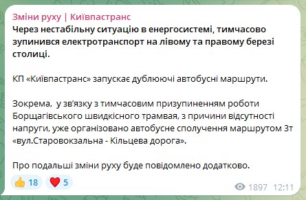 По информации КГГА, энергетики уже начали восстановительные работы, чтобы стабілізувати ситуацию. Из-за обесточивания на обоих берегах столицы остановилось движение трамваев и троллейбусов. Коммунальщики оперативно реагируют на коллапс транспортной системы.