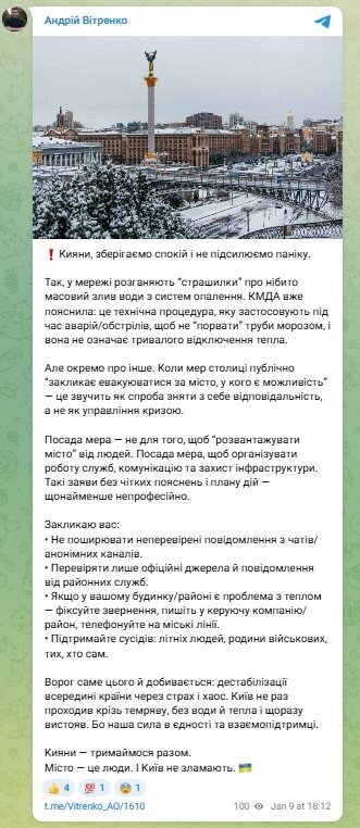 По словам Витренко, КГГА применяет слив теплоносителя в случаях аварий или обстрелов исключительно для того, чтобы мороз не разорвал трубы, пока система временно остановлена. Это превентивная мера безопасности, а не приговор для отопительного сезона.