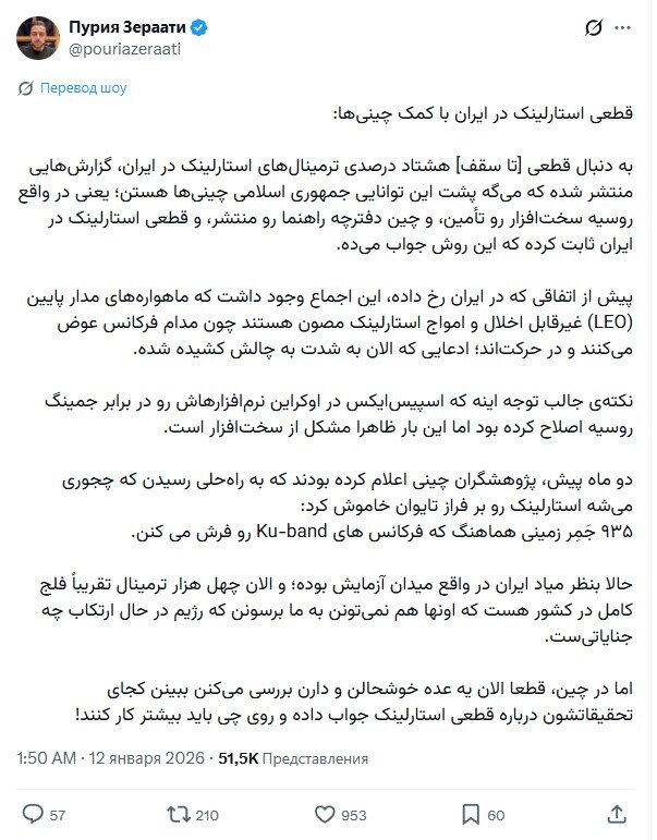 Компания Starlink в Иране прекратила работу при содействии Китая. После того как в стране вышли из строя до 80% терминалов, появились сообщения о причастности КНР к блокировке спутникового интернета.