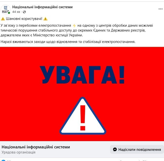 Украинцев предупредили о возможных проблемах с доступом к важнейшим государственным базам данных. Работа реестров нарушена из-за проблем с электричеством на технической площадке.