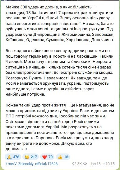 "Как всегда, там, где Россия пытается разрушить, украинцы поддерживают друг друга, и именно внутренняя устойчивость сейчас больше всего нужна.Каждый такой удар против жизни – это напоминание, что нельзя прекращать поддержку Украины. Ракеты к системам ПВО нужны ежедневно, особенно во время зимы. Мир может ответить на этот террор России новым пакетом помощи Украине. Мы рассчитываем на ускорение поставок, о чем уже договорено с Америкой и Европой. Россия должна понимать, что холод войну выиграть не поможет. Спасибо всем, кто помогает", - добавил лидер Украины.