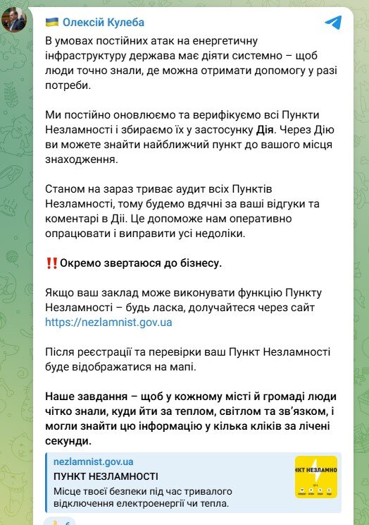 "На данный момент продолжается аудит всех Пунктов Несокрушимости, поэтому будем благодарны за ваши отзывы и комментарии в "Дії". Это поможет нам оперативно разработать и исправить все недостатки", - подчеркнул Кулеба.