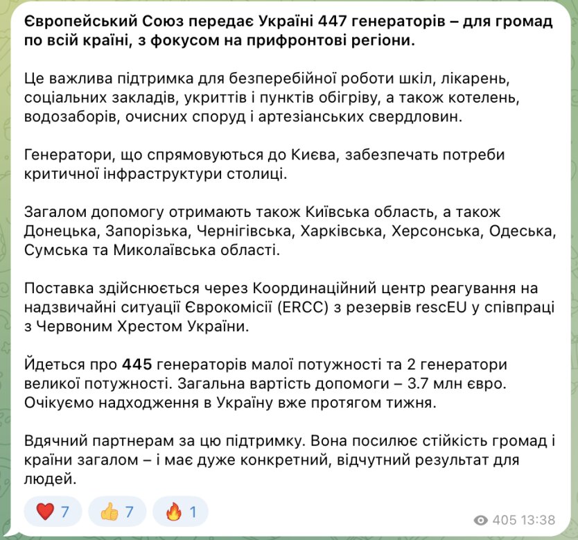 Европейский Союз передает Украине значительную партию энергетического оборудования. Речь идет о 447 генераторах, которые распределят между общинами по всей стране с особым акцентом на прифронтовые регионы.