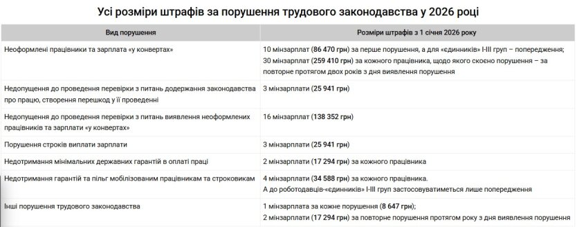 В Украине с 1 января 2026 года существенно выросли суммы штрафов за нарушение трудового законодательства. Это произошло автоматически из-за повышения минимальной заработной платы, которая теперь составляет 8647 гривен.