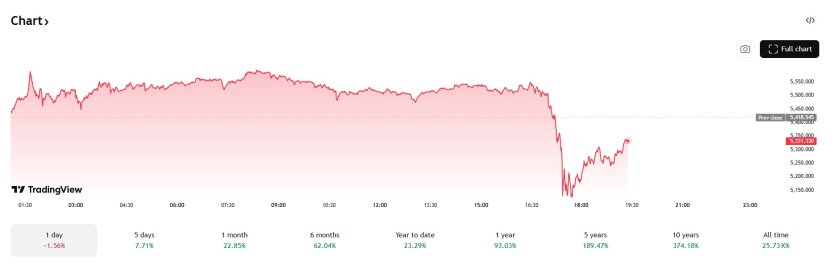 Инцидент произошел в промежутке с 17:00 до 17:15. Цена тройской унции мгновенно опустилась с 5505 до 5098 долларов. "Просадка" составила 407 долларов или 7,4%.