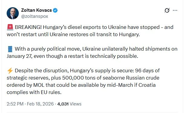 При этом представитель венгерского правительства Золтан Ковач написал в соцсети Х: "Экспорт дизельного топлива из Венгрии в Украину прекратился и не восстановится, пока Украина не возобновит транзит нефти в Венгрию".