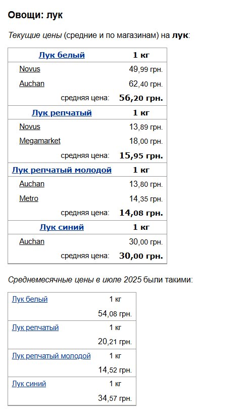 Цибуля демонструє найбільший розкид цін серед розглянутих овочів. Біла цибуля є найдорожчою - у середньому 56,20 гривні за кілограм, з цінами від 49,99 гривні в Novus до 62,40 гривні в Auchan. Ріпчаста цибуля значно доступніша - 15,95 гривні за кілограм у середньому, при цьому в Novus її можна купити за 13,89 гривні, а в Megamarket — за 18,00 гривень.