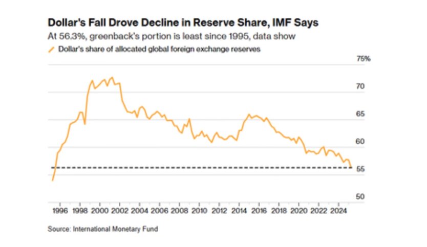 За даними Міжнародного валютного фонду, у другому кварталі частка долара в міжнародних резервах справді знизилася до 56,3%, що є мінімальним показником з 1995 року. Однак, за словами експерта, це не свідчить про системну відмову від американської валюти.
