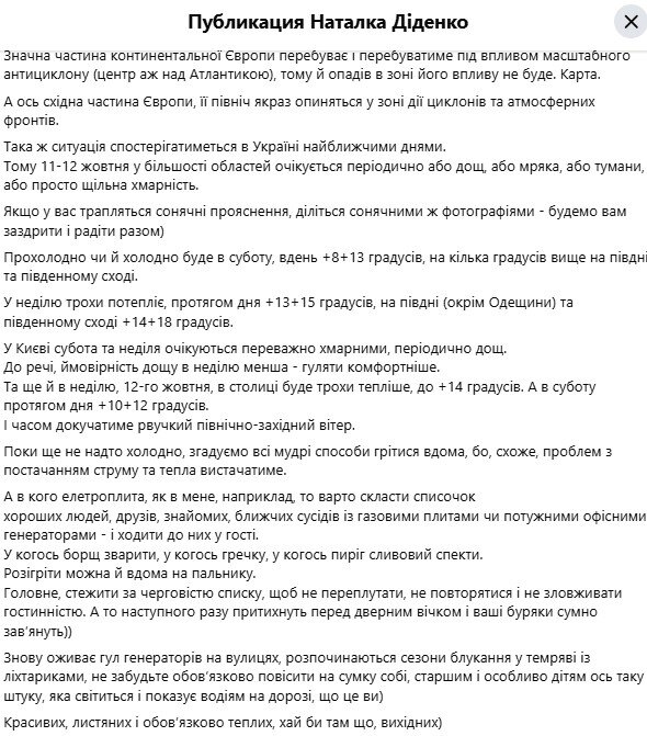 Про це написала в соцмережах синоптик Наталка Діденко.