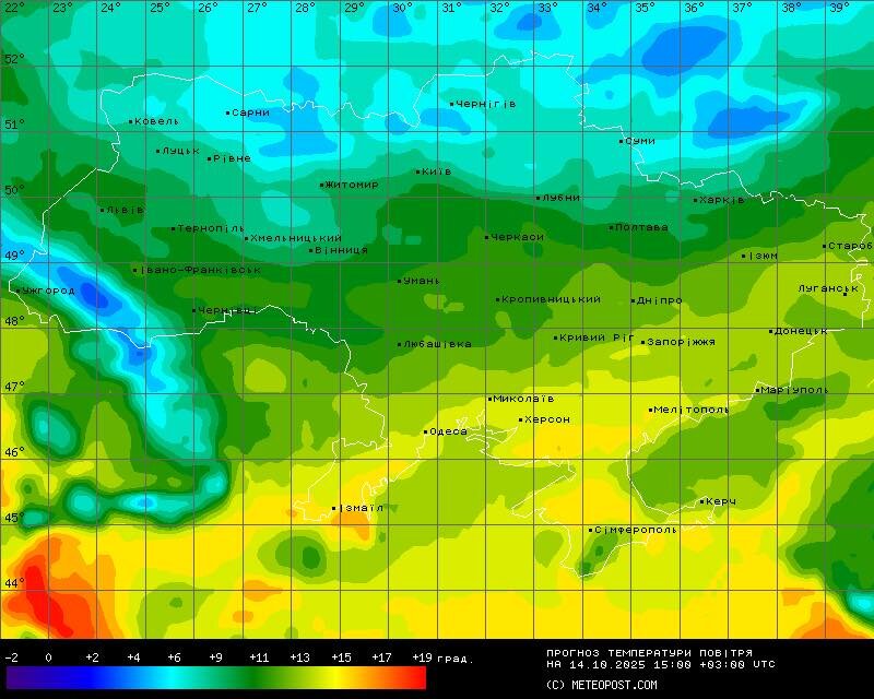 У вівторок, 14 жовтня, в Україні очікується холодна погода. Про це повідомила синоптикиня Наталка Діденко. За її прогнозом, найближчої ночі температура повітря знизиться до +2...+6 градусів, а вдень підвищиться лише до +6...+10 градусів.