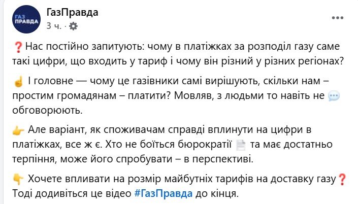 "Нас постійно запитують: чому в платіжках за розподіл газу саме такі цифри, що входить у тариф і чому він різний у різних регіонах? І головне — чому це газівники самі вирішують, скільки нам, простим громадянам, платити?", — зазначають на початку відео автори "ГазПравди", визнаючи поширене невдоволення споживачів.