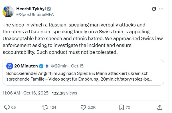 "Це неприпустимі висловлювання, що розпалюють ненависть і міжнаціональну ворожнечу. Ми звернулися до швейцарських правоохоронців із проханням розслідувати інцидент і притягнути винних до відповідальності. Подібна поведінка є неприпустимою", — написав він.