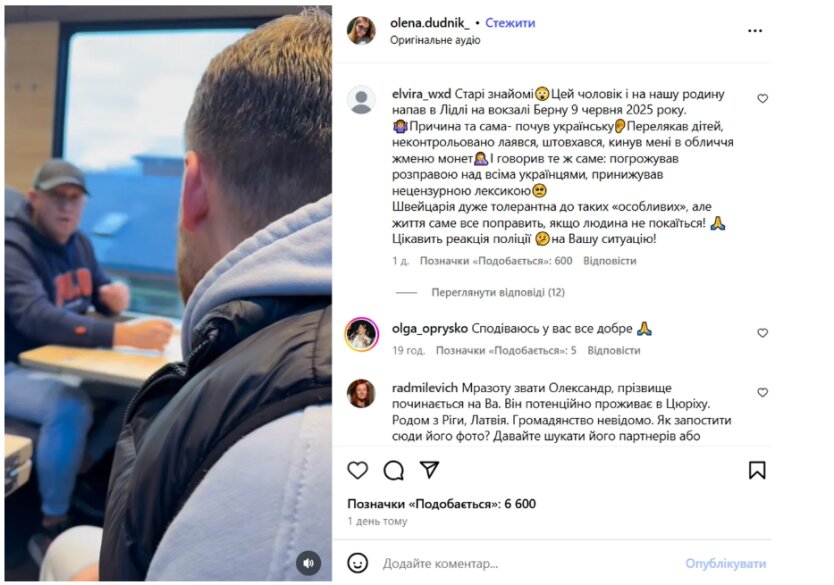 "Конфлікт виник через те, що цей персонаж почув, як я з чоловіком розмовляю українською! Мій чоловік народився у Швейцарії, має швейцарське громадянство, чудово розуміє українську, адже його батьки з Білорусі. На відео видно всі його погрози, маніпуляції та агресію! Далі була бійка і виклик поліції!" — розповіла жінка.
