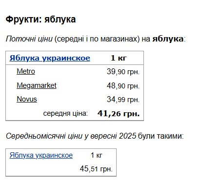Українські яблука залишаються одним із найдоступніших продуктів. На ринках їх можна придбати за 20-40 грн/кг, у супермаркетах — близько 41 грн/кг у середньому. Ціни залежать від сорту та якості плодів. На ринках легше знайти сезонні, свіжі яблука, особливо в період збору врожаю.