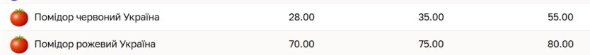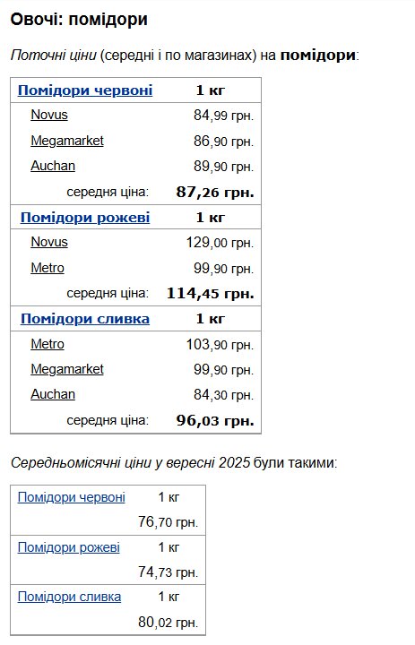 З помідорами ситуація цікавіша. Червоні у супермаркетах коштують у середньому 87,26 грн/кг, рожеві — 114,45 грн/кг, а "сливка" — 96,03 грн/кг.