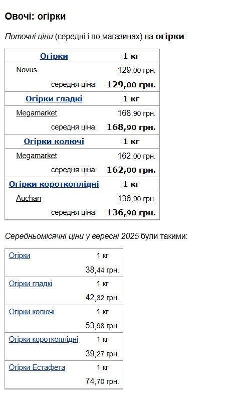 Огірки демонструють найзначніший розрив у цінах. На ринках середня вартість тримається на рівні 95-105 гривень за кілограм, тоді як у супермаркетах ціна сягає 168,90 гривні за кіло (гладкі). Звичайні коштують близько 129,00 грн/кг.