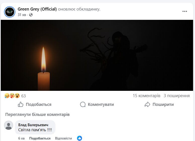Інші учасники колективу Green Grey також підтвердили цю інформацію, змінивши зображення на обкладинках своїх сторінок на фотографію зі свічкою.