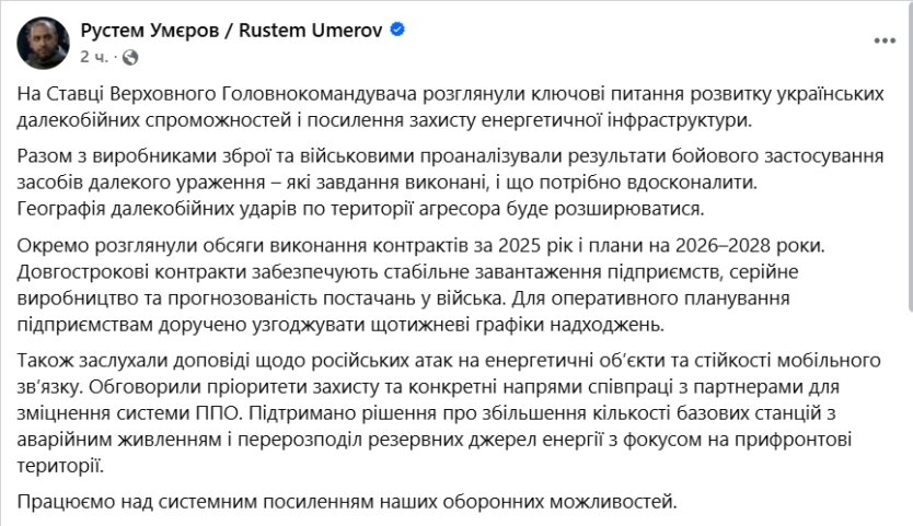 Секретар РНБО підкреслив, що географія далекобійних ударів по території агресора буде розширюватися, а довгострокові контракти з виробниками зброї забезпечать стабільне завантаження підприємств та прогнозованість постачань у війська.