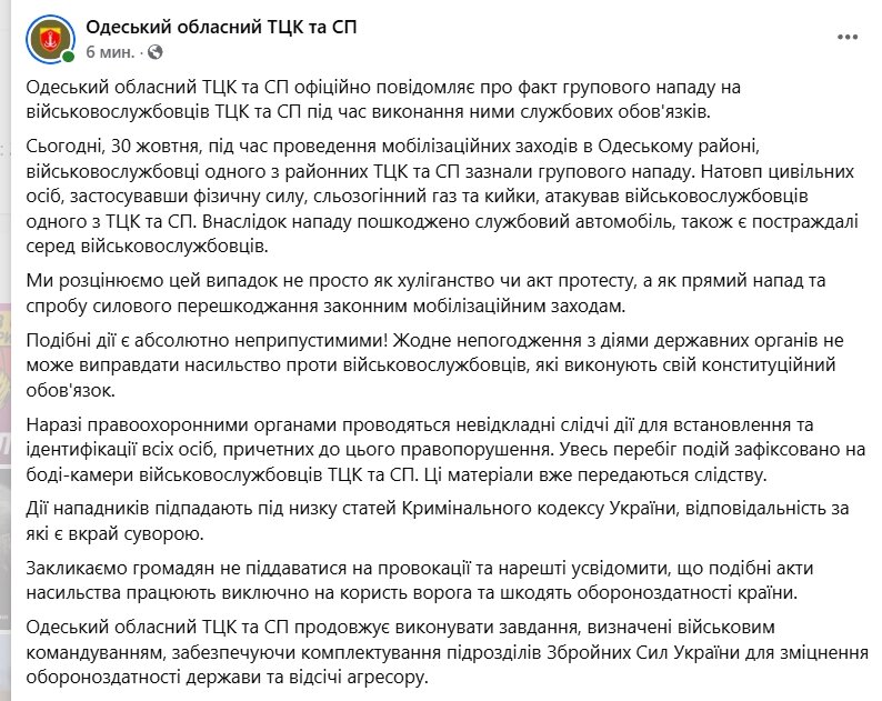 Вранці 30 жовтня в Одесі біля ринку "Сьомий кілометр" стався масштабний інцидент за участю представників територіального центру комплектування.