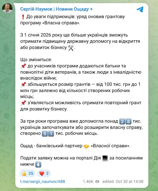 "За три роки програма вже допомогла більш як 28 тисячам українців розпочати або розширити власну справу, створено 51 тисячу робочих місць. Ощад — банківський партнер "Власної справи", — зазначив Наумов.
