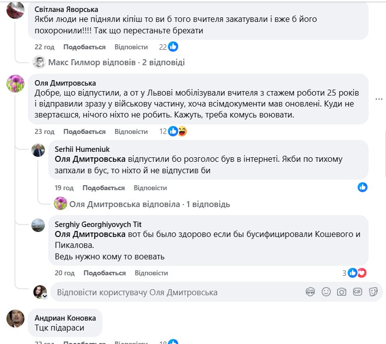 "Якби люди не підняли шум, то ви б того вчителя замучили й уже б поховали!!! Тож перестаньте брехати", — обурювалися користувачі.