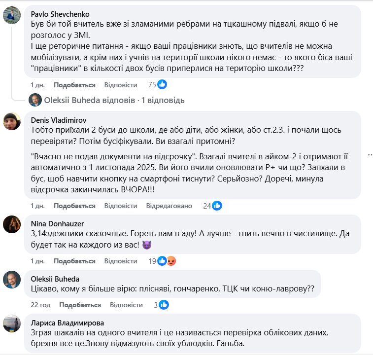 Інші користувачі ставили риторичні питання щодо законності дій: "Якщо ваші працівники знають, що вчителів не можна мобілізувати, а крім них і учнів на території школи нікого немає — то навіщо ваші "працівники" приперлися двома бусами на територію школи???".