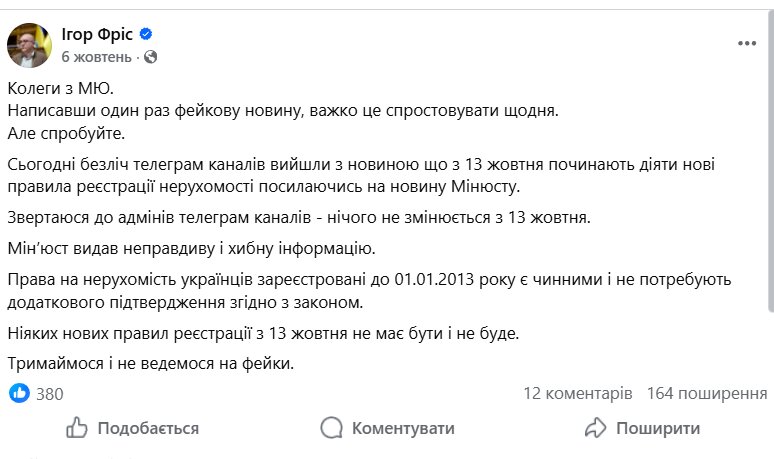 "Сьогодні багато телеграм-каналів поширюють інформацію про те, що нібито з 13 жовтня починають діяти нові правила реєстрації нерухомості. Звертаюся до адміністраторів каналів: з 13 жовтня нічого не змінюється", - пояснив він.