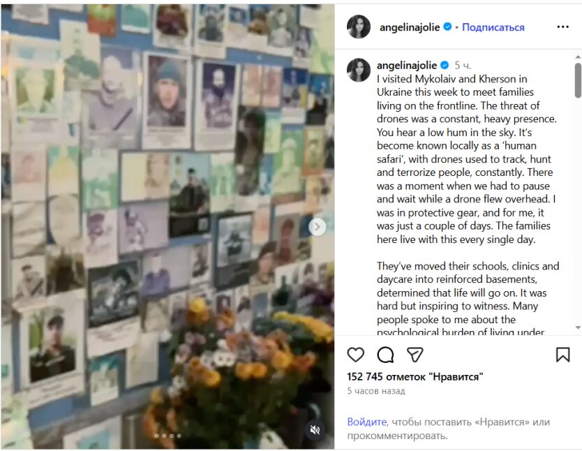 Джолі повідомила, що цього тижня побувала в Миколаєві та Херсоні, щоб зустрітися з родинами, які живуть на лінії фронту. За її словами, загроза з боку безпілотників відчувалася постійно, і перебувати там було непросто. Джолі описала, як чула гул дронів у небі, які місцеві мешканці вже прозвали "сафарі на людей" - їх використовують для безперервного спостереження, переслідування й тероризування мирного населення.