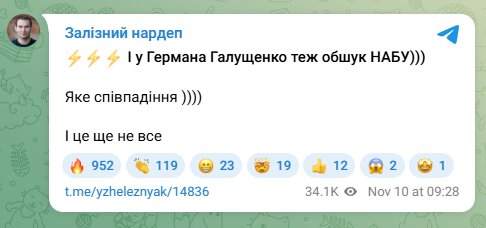 "У Германа Галущенка обшук НАБУ. І в "Енергоатомі", кажуть, теж", – написав він.