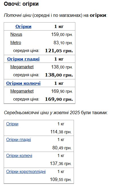 На місцевих ринках одеські огірки коштують від 100 до 110 гривень за кілограм, при цьому середня ціна становить 105 гривень. Це досить висока вартість порівняно з іншими овочами, що пояснюється сезонністю та особливостями вирощування в осінній період.