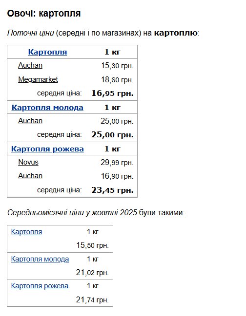 Картопля залишається одним із найпопулярніших овочів на українських столах. За даними моніторингу цін у різних торговельних мережах, поточні пропозиції суттєво відрізняються. У супермаркетах Auchan молода картопля коштує 25 гривень за кілограм, тоді як звичайна — від 15,30. У мережі Megamarket ціна становить 18,60 гривні, а в Novus рожева картопля пропонується за 29,99 гривні. Середня ціна в магазинах коливається від 16,95 до 25 гривень за кілограм залежно від сорту.