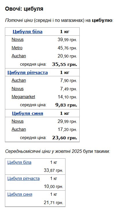 Цибуля також демонструє значний розкид цін. У супермаркетах біла цибуля коштує від 20,90 до 45,76 гривень за кілограм, середня ціна становить близько 35,55 гривень. Ріпчаста цибуля дешевша — від 7,49 до 14,10 гривень, середня вартість складає 9,83 гривні. Синя цибуля пропонується за ціною від 17,20 до 29,99 гривень, у середньому 29,99 гривень за кілограм.