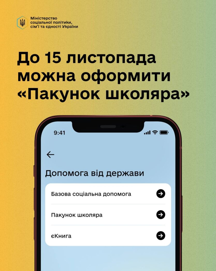 Українські родини можуть оформити "Пакунок школяра" до 15 листопада 2025 року - саме до цього часу триває прийом заяв на отримання допомоги.