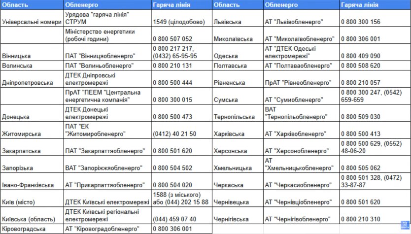 Гаряча лінія Обленерго. Заздалегідь запишіть номер гарячої лінії вашого постачальника (його можна знайти у квитанції за світло). Дзвінки на номери, що починаються з 0 800, є безкоштовними по всій Україні.