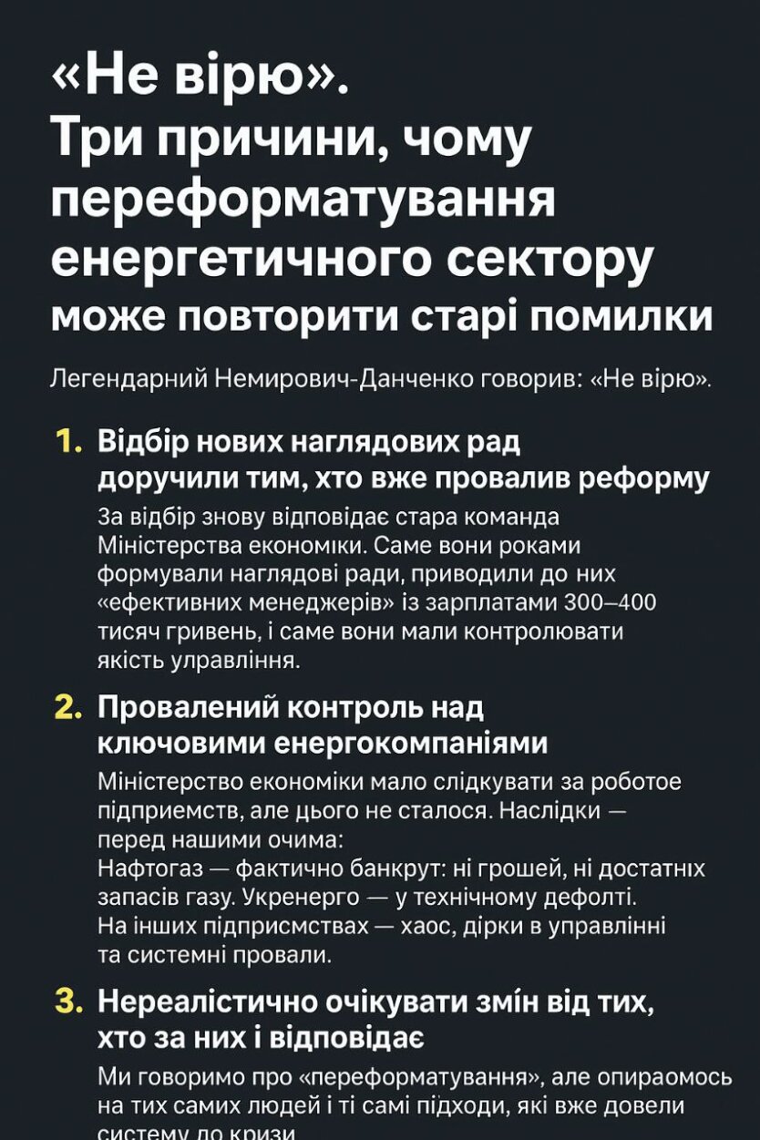 "Легендарний Немирович-Данченко говорив: "Не вірю". І сьогодні ці слова – найточніша реакція на оголошене "перезавантаження" енергетичного сектору. Нам знову обіцяють системні зміни, оновлення керівництва та наглядових рад", - підкреслив він.