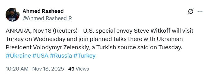 Додаткової ваги завтрашнім переговорам у Туреччині надає інформація агентства Reuters: за даними кореспондента Ахмеда Рашида, до країни має прибути спецпосланець президента США Стів Віткофф. Він проведе зустріч із Зеленським, що може посилити міжнародну координацію перед подальшими дипломатичними кроками.