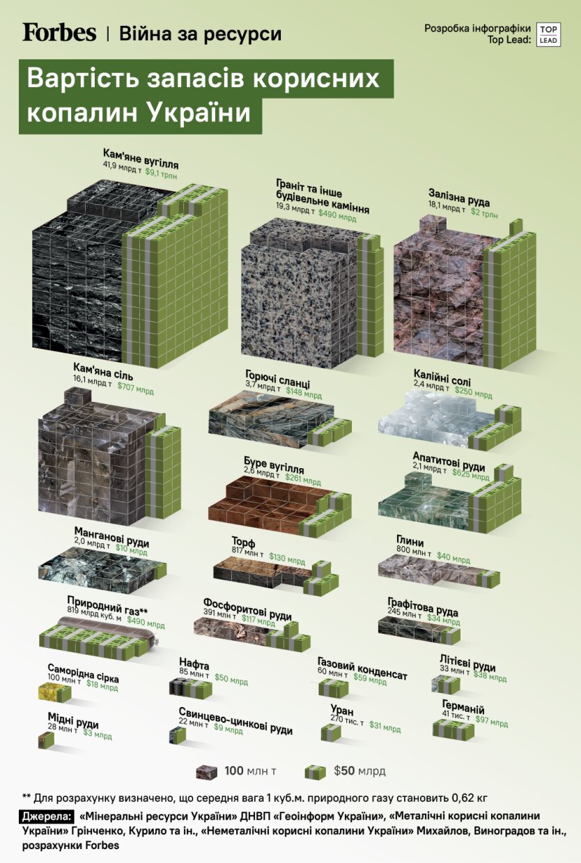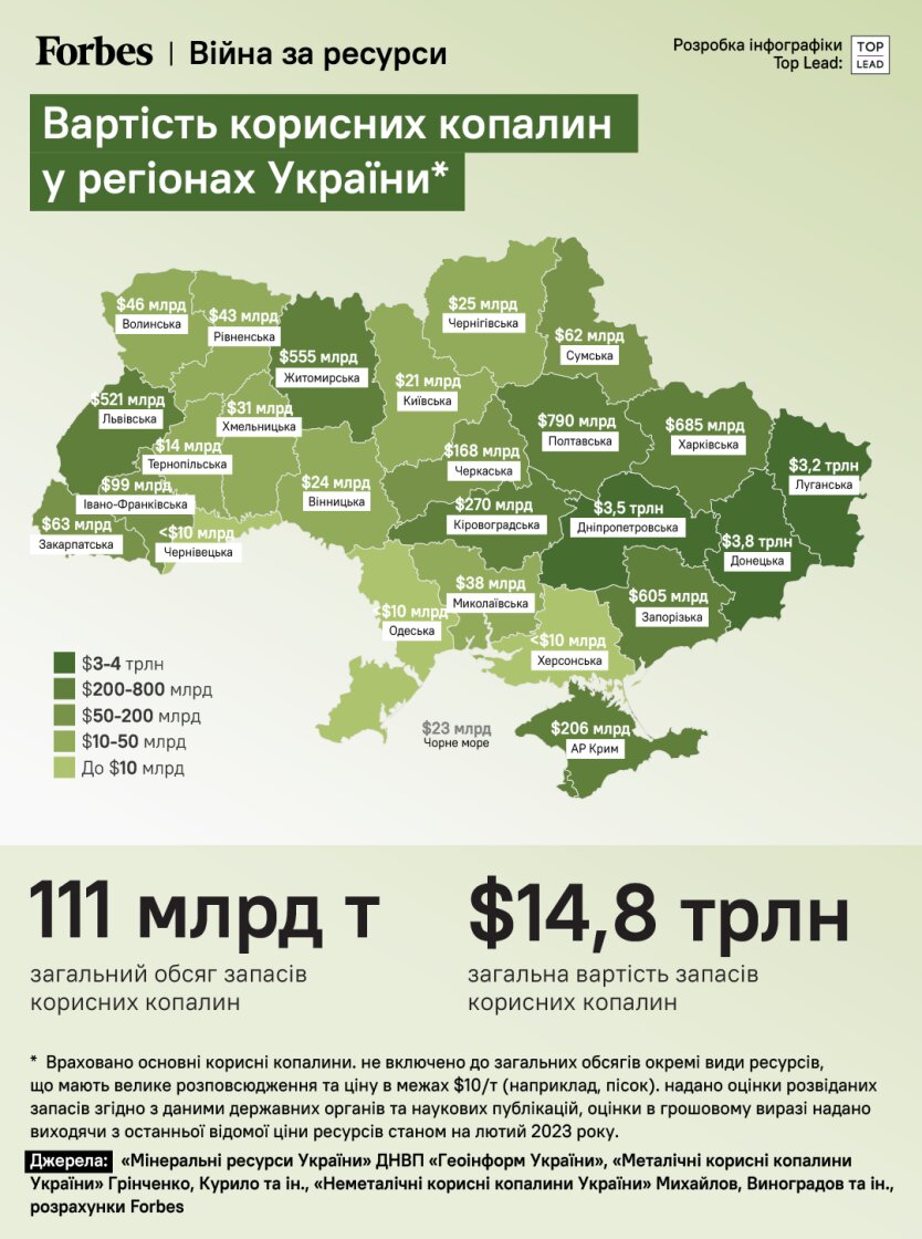 Загалом Україна може похвалитися понад 111 мільярдами тонн різних корисних копалин - за оцінками їхня загальна вартість досягає приблизно 14,8 трильйонів доларів.