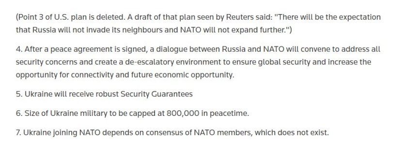 (Пункт 3 американського плану видалено. Проєкт цього плану, з яким ознайомилося Reuters, гласив: "Очікується, що Росія не буде вторгатися в сусідні країни, а НАТО не буде надалі розширюватися.")