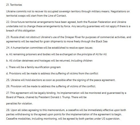 Зазначимо, що передбачуваний текст мирного плану Трампа містить 28 пунктів, зокрема:
