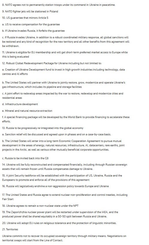 - Після підписання мирної угоди буде скликано діалог між Росією та НАТО для розгляду всіх питань безпеки й створення деескалаційного середовища для забезпечення глобальної безпеки та розширення можливостей для взаємозв’язку і майбутніх економічних можливостей.