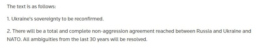 - Між Росією та Україною, а також НАТО буде досягнуто повної і всеосяжної угоди про ненапад. Усі неоднозначності останніх 30 років будуть врегульовані.