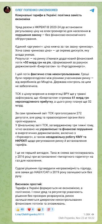 За словами Попенка, уряд разом із НКРЕКП у 2023-24 роках встановили регульовану ціну на електроенергію для населення з грубим порушенням закону - без фінансово-економічного обґрунтування.