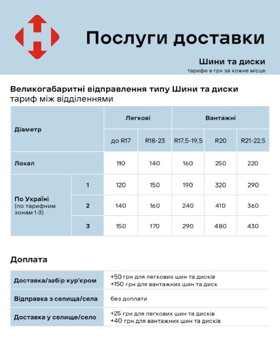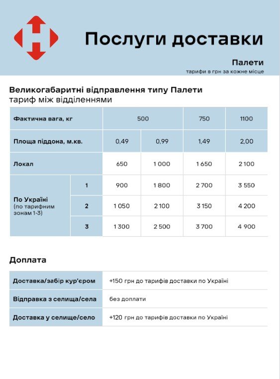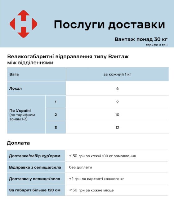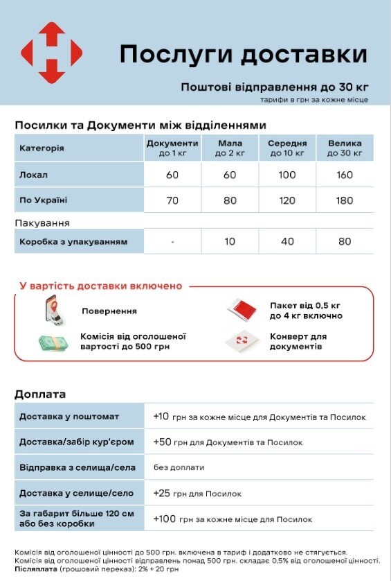міські відправлення між відділеннями: 100 грн до 10 кг, 160 грн до 30 кг;