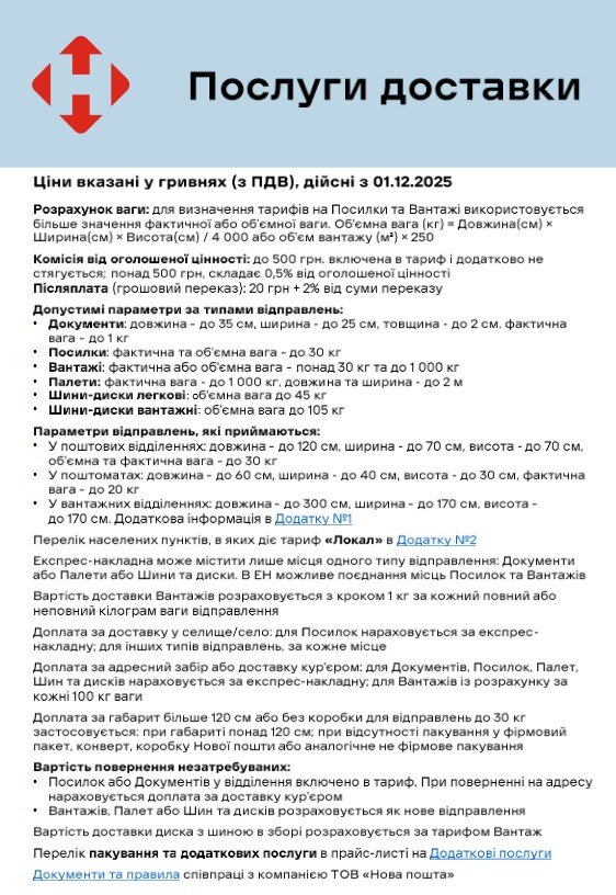 З 1 грудня 2025 року "Нова пошта" запроваджує оновлені тарифи. Компанія пояснює перегляд вартості необхідністю підтримувати стабільну швидкість доставки та незмінну якість сервісу.