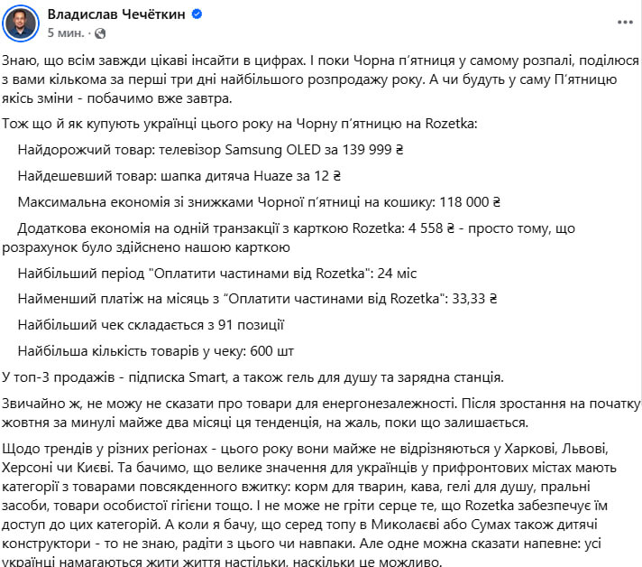 Співвласник Rozetka Владислав Чечоткін оприлюднив статистику перших трьох днів Чорної п'ятниці. Найдорожчою покупкою став телевізор Samsung OLED за 139 999 гривень, найдешевшою — дитяча шапка Huaze за 12 гривень.