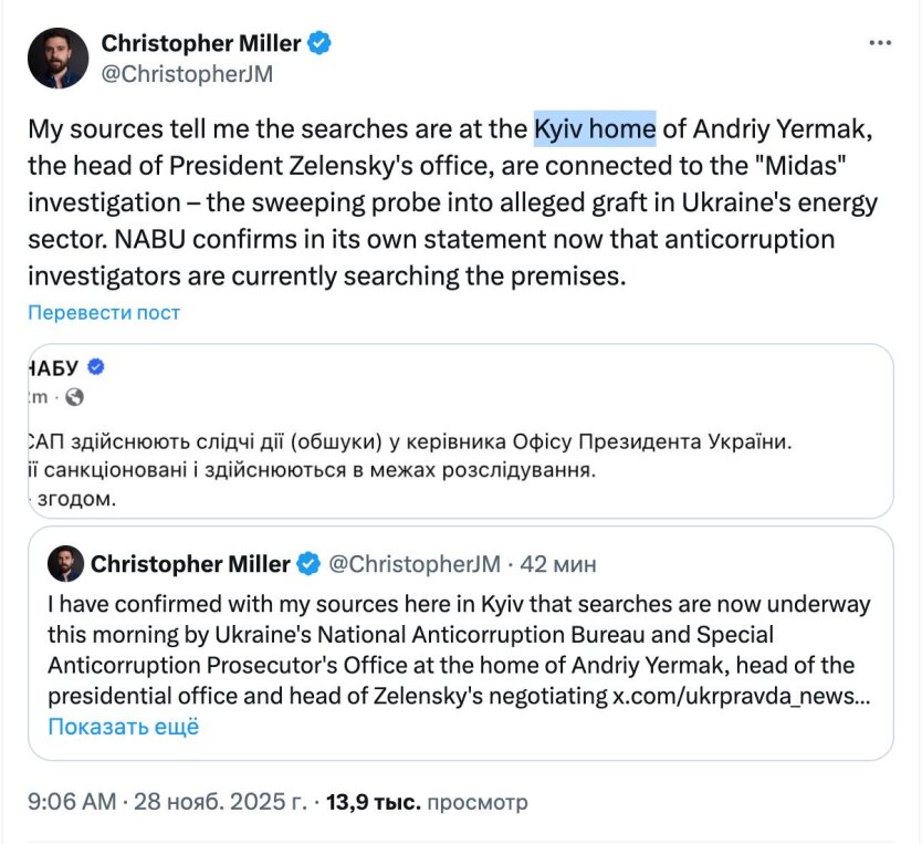 Про обшуки у будинку Андрія Єрмака також повідомив журналіст Financial Times Крістофер Міллер.