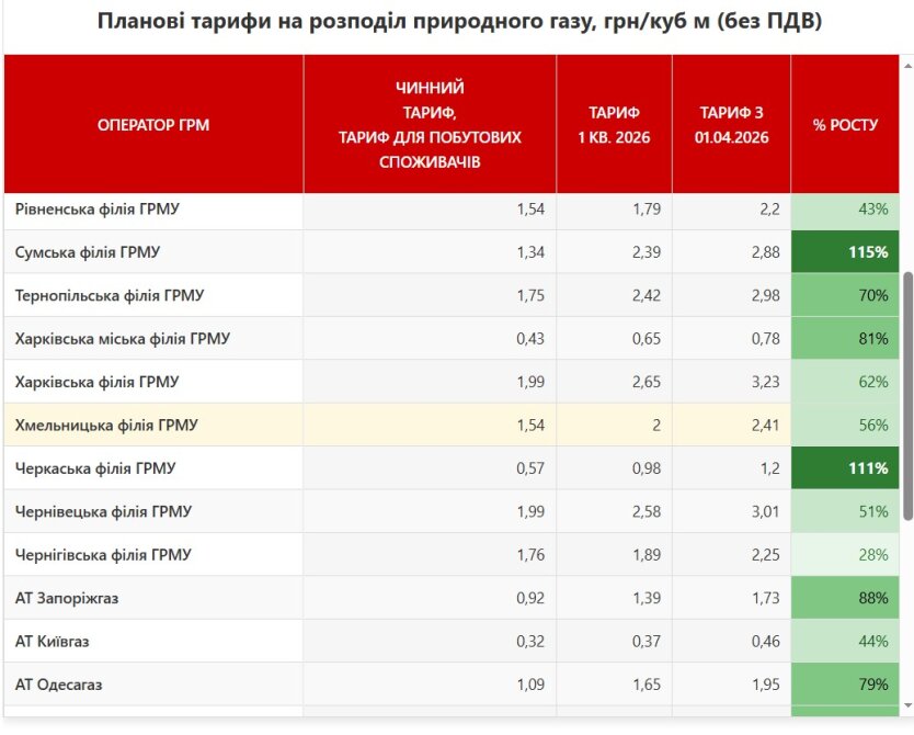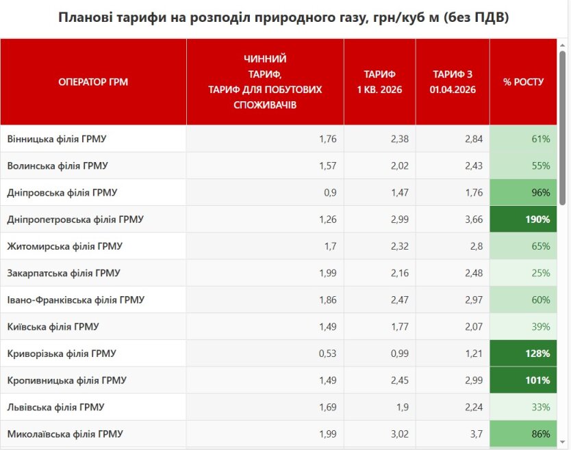 - Найбільше підвищення тарифів планується для Дніпропетровського філіалу ГРМУ – до 3,66 грн/куб.м (без ПДВ) з 1 квітня 2026 р., у 2,9 раза більше, ніж діючий тариф.