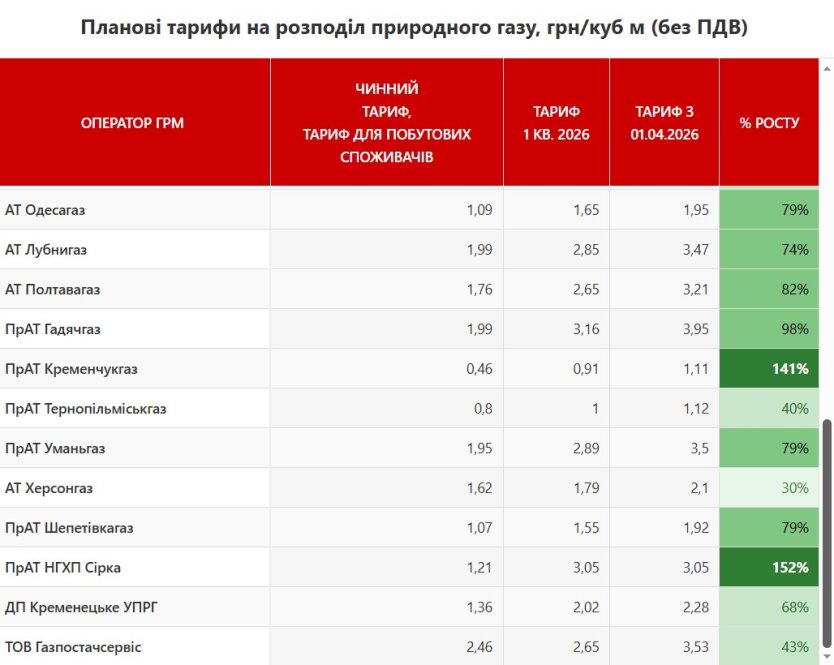 - Найвищий тариф на розподіл газу у 2026 р. буде у ЧАО "Гадячгаз" – 3,16 грн/куб.м (без ПДВ) з 1 січня та 3,95 грн/куб.м (без ПДВ) з 1 квітня 2026 р. Загальний ріст – 98%.