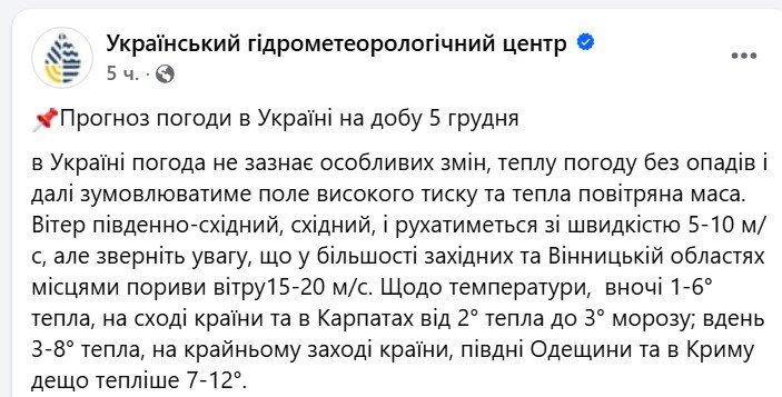 5 грудня погода в Україні залишиться стабільною — тепло і без опадів. Такі умови формує поле високого тиску та тепла повітряна маса, повідомляє Український гідрометеорологічний центр.